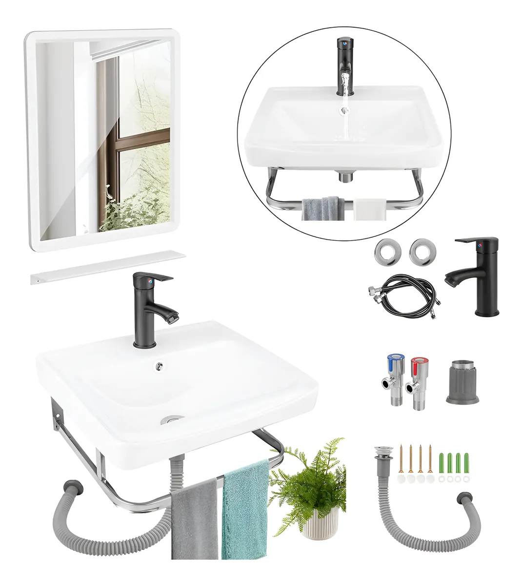 3. COMBO COMPLETO DE LAVABO PARA MONTAR EN LA PARED: este paquete combinado completo incluye un lavabo blanco para montar en la pared, una barra para toallas de acero inoxidable y un soporte de montaje, un grifo monomando, líneas de suministro, rebosadero, desagüe y herrajes, lo que proporciona todo lo que necesita para un proceso de instalación conveniente. Con todos los componentes esenciales incluidos, este combo simplifica el proceso de instalación, lo que garantiza una experiencia sin complicaciones de principio a fin.
